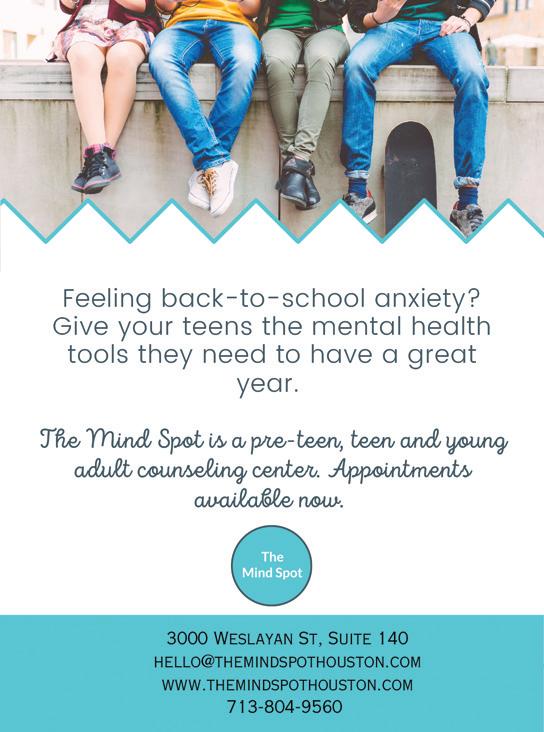 BELLAIRE BUZZ SEPTEMBER 2023 61 • Support for teenagers, young adults, and couples. • Help with grief, self-limiting beliefs, low self-esteem, anxiety, depression, and difficult relationship issues. • Experience how authentic connection with a therapist is key for bringing about positive change and growth. Here to listen and help “Allow room for growth and change and find the good in your life.” www.theconativegroup.com • 713.993.7030 Tami