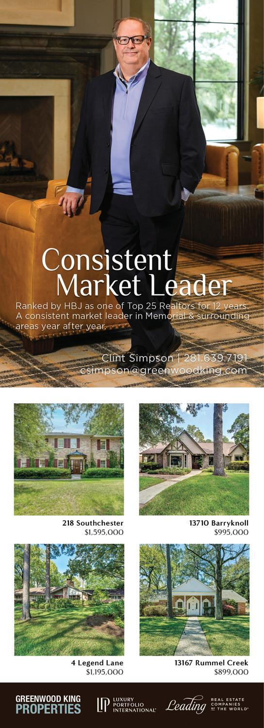 MEMORIAL BUZZ OCTOBER 2022 69 8955 Katy Freeway, Suite 308, Houston, TX 77024 713-784-7606 • www.robadamsproperties.com 12330 Mossycup - $1,200,000 2020 Mason - $495,000 Hunterwood FOR RESULTS MIDTOWN Melissa Lange SOLD 347 Hunters Trail - $1,799,000 Miller Friedman