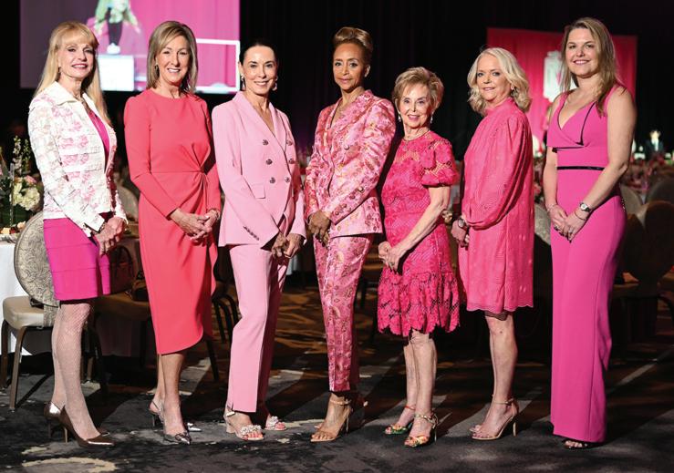 Nelda Blair, Shelley Reeves Boyer, Sue Smith, Cheryl Creuzot, Evelyn Leightman, Chree Boydstun, and Janette Marx (pictured, from left) donned their most festive pink attire at the American Cancer Society (ACS) Tickled Pink luncheon. More than 650 supporters were among the record-breaking crowd at The Post Oak Hotel