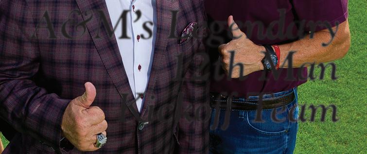 On our cover: Former Aggie head coach Jackie Sherrill and his 12th Man Kickoff Team are bonded for life. Pictured (from left) are Warren Barhorst, Ronnie Glenn, Coach Sherrill, and Dave Coolidge. Cover photo by Michael Hart, hartphoto.com A special thank you to Houston Christian High School for allowing us to photograph on their field.