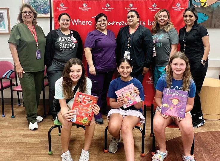 row, from left) presented donated books for the patients at Texas Children’s Pediatrics Ripley House. The Pin Oak and Pershing Middle School seventh graders have a history of serving Texas Children’s, including creating care bags for pediatric inpatients during their fifth-grade year. Staff members Virginia Villarreal, Stephanie Sanchez, Sandra Martinez, Marissa Nunez, Selene Escamilla, and Mayra Mendez (pictured, top row, from left) are thankful for the Girl Scouts’ support which included new and gently used books that patients can take home after their visit to Texas Children’s.