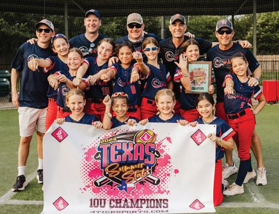 After remaining undefeated for seven games over a weekend in Conroe, WUSA’s 10U Wave team emerged triumphant in the 4TS Texas State Tournament, taking home first place. Pictured (back row, from left) are coaches Garth Beinart, Brad Kirklin, JB McAllister, Steve Roberts, Nick Nicodemus; (middle row, from left) Savannah Beinart, Nina Jalbrzykowski, Kipling Roberts, Natalia Cotton, Hays McAllister, Connelly Martin-Harvey, Emma Hughes; (front row, from left) Annabeth Kirklin, Natalia Baltodano, Sloane Nicodemus, Shiloh Landrum, and (not pictured) Carson Frels. Fourteen ranked teams traveled from towns all over Texas like College Station, Normangee, and Caldwell to compete in this C-Class Tournament.The talented young team completed their 8-week summer season with an impressive record of 31 wins, 8 losses, and 2 ties, including a USFA Open Co-State Championship and a FASA Open State third-place finish in addition to the 4TS State Championship.
