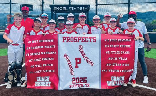 The 12U Prospects Red Team brought home some serious hardware from the Iron Forge Tournament at the Ripken Experience in Pigeon Forge, Tennessee. Over five days and eight hard-fought games, these boys battled their way to a championship title and left their mark on the tournament. Off the field, the team made the most of their time in the Smoky Mountains, enjoying Dollywood, go-kart racing, zip-lining, white water rafting, and mountain coasters. The team includes players from Memorial Middle School, Spring Forest Middle School, Cornerstone Academy, and Western Academy. Pictured are (back row, from left) Coach Cedric Hebert, Luke Canfield, Duke Newsom, Boyd Henderson, Tyler Evans, Bo Wells, Ethan Kerr, Coach Chris Williams; (front row, from left) Weston Lasseigne, Jack Preisler, Brooks Wannarka, Drake Hunter, Will Rausch, and Harrison Braniff.