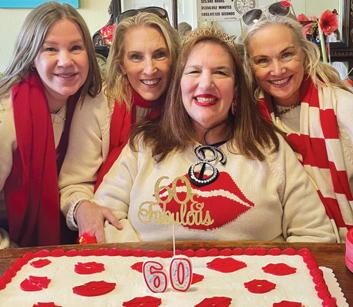 Birthday girl Karen Vine Fuller (pictured, second from right) celebrated her 60th at a birthday celebration that lasted 12 hours. Donning her signature bright-red lipstick, Karen kissed her 50s goodbye at a party hosted by childhood friends Shelley Hoge Schneider, Sandra Rohlfs Younger, and Kristen Nelson Lauro (pictured, from left, with Karen). Starting at 10 a.m., partygoers raised their glasses every 60 minutes for a toast to Karen. The party continued all day and night before wrapping up at 10 p.m. In addition to brunch and dinner, guests enjoyed a lipstick-mark-kissed cake and lip-shaped sugar cookies. Party favors included tubes of red lipstick, lip-shaped whistles, “Sip and Celebrate 60” cups, and swizzle sticks decorated with a photo of the guest-of-honor in a 60th birthday hat. A highlight of the party was Kinder HSPVA senior Braeden Payne leading the crowd with a “Happy Birthday” singalong while playing his tuba.