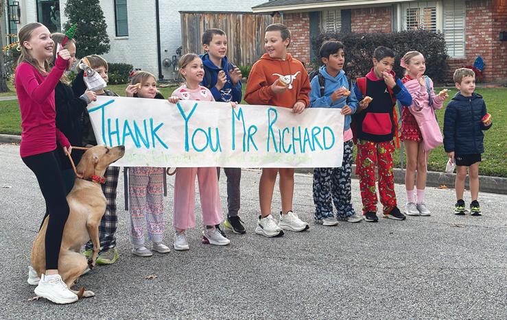 Richard a heartfelt send-off with a banner on his last day. Parents say they will miss the way he cared for their little ones, day after day, and they wish him the very best in retirement. Pictured are Rummel Creek students (from left) Libby Buster, Piper Esslinger, Tripp Esslinger, Collins Morrison, Molly Buster, Tucker Morrison, Tyler Buster, William Walters, Micah Scarborough, Wiley Morrison, and Merrick Esslinger.