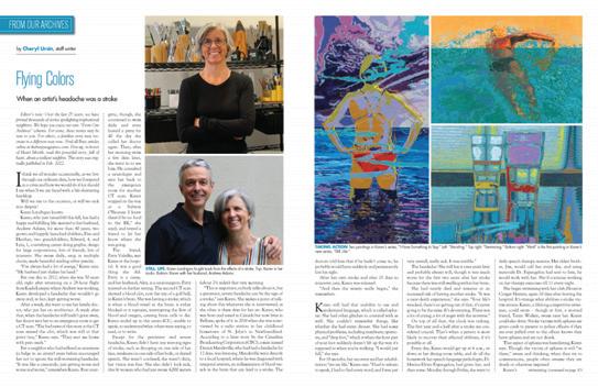 I wanted to let you know how many people are reading your magazine. Since the article on my stroke awareness [Flying Colors: When an artist’s headache was a stroke by Cheryl Ursin] was published [originally in Feb. 2022 and in “From the Archives” in Feb. 2026], I have received numerous calls, texts, emails, and requests for personal meetings.