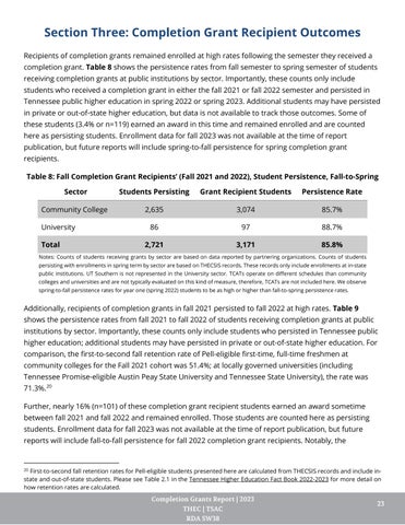 Table 8: Fall Completion Grant Recipients’ (Fall 2021 and 2022), Student Persistence, Fall-to-Spring