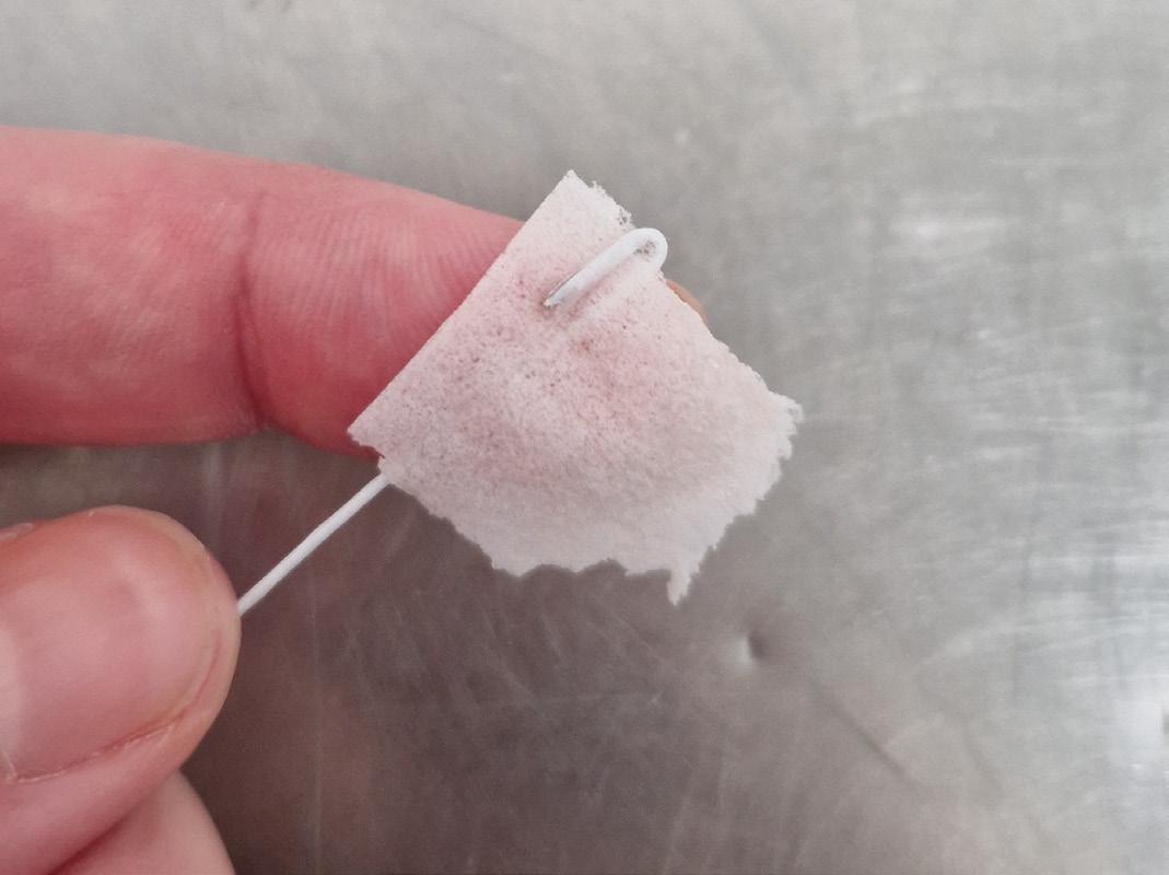 Create your wafer paper flowers by making a small loop in wire then, using a small piece of offcut wafer paper, dampen the wafer paper using a small sponge dipped in vodka sweep it over the wafer paper and feed through the loop and around to form a bud. 1.