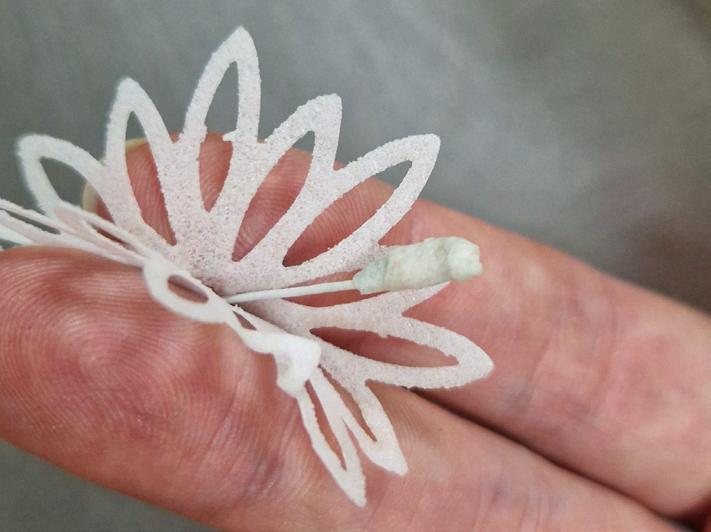 Using a craft paper punch, cut out flower shapes. Condition the petals using a sponge lightly dampened with vodka again, feed them through the wire and attach and shape whilst still flexible. Keep adding layers until you have created a flower you are happy with. 9.