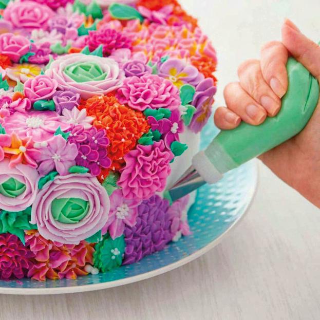 A Lambeth cake will never go out of style. And the beauty is, you can make it a unique design every time! Here, Sarah used a variety of piping tips and colours to create this stunning summer edition. It's all about layering - by changing up the nozzles you use you'll achieve an eye catching finish on every cake.