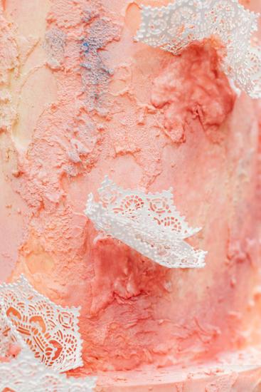 To add the cake lace to the cake, use a small amount of remaining royal icing as a glue. Allow to dry then paint over the top to blend it in. It doesn’t need to be perfect though as this will be covered by your wafer flowers which you can then add in any design you like.