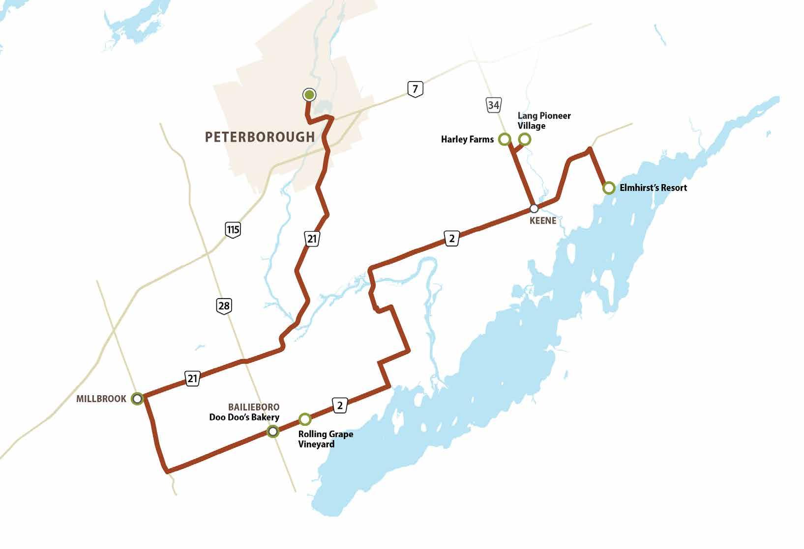 The rolling hills of southern Peterborough County provide the perfect backdrop to view the fall colours. This route will bring you to the historic town of Millbrook, a quaint village lined with locally owned shops selling artisan work, food products, art, and more. Prep for the perfect fall picnic by picking up charcuterie from Millbrook Mercantile, baked goods from Pastry Peddler, and Doo Doo’s famous butter tarts for dessert.
