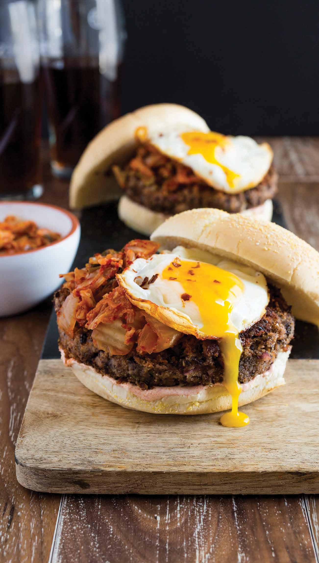 A blend of nutrient dense black beans and umami rich mushrooms that are so good you won’t miss the meat. Topped with tangy kimchi and a fried egg this burger really hits the spot!