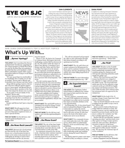 from the lawsuit. Wayne P. Tate, the lawyer for Community Common Sense, filed papers last week challenging a motion filed by attorneys for the city, who wish to strike the names of Mayor Sam Allevato, Councilmen Larry Kramer and John Taylor, and City Attorney Hans Van Ligten from the lawsuit. “This argument, if sustained, will set the precedent that elected and appointed government officials are authorized to violate the First Amendment of the citizens they represent with virtual impunity,” Tate wrote. The city’s motion argues that the lawsuit threatens the four men’s freedom of speech, using the state’s anti-Strategic Lawsuit Against Public Participation law, which is intended to protect citizens from litigation that threatens to silence or intimidate them from public participation. Last week, publishers for Common Sense announced that lawyers from the First Amendment Project, an Oaklandbased nonprofit organization, will join Tate as co-counsel. WHAT’S NEXT: The anti-SLAPP motion is scheduled to be heard in Orange County Superior Court on March 6 by Judge James Di Cesare. FIND OUT MORE: For the full story and updates, visit www.thecapistranodispatch. com. – BP