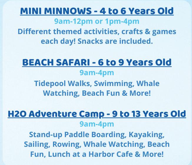 Sessions run June 3 to Aug. 16 with Mini Mates Day Camp for kids ages 6 to 8 with prices at $575 per week ($345 for the week of July 1 to 3) for beginning sailing and safety being taught. The Wayfarer Camp is for kids 8 to 10 ($598/$359) with lessons in the importance of ocean safety and safe boating along it rigging and sailing skills development.