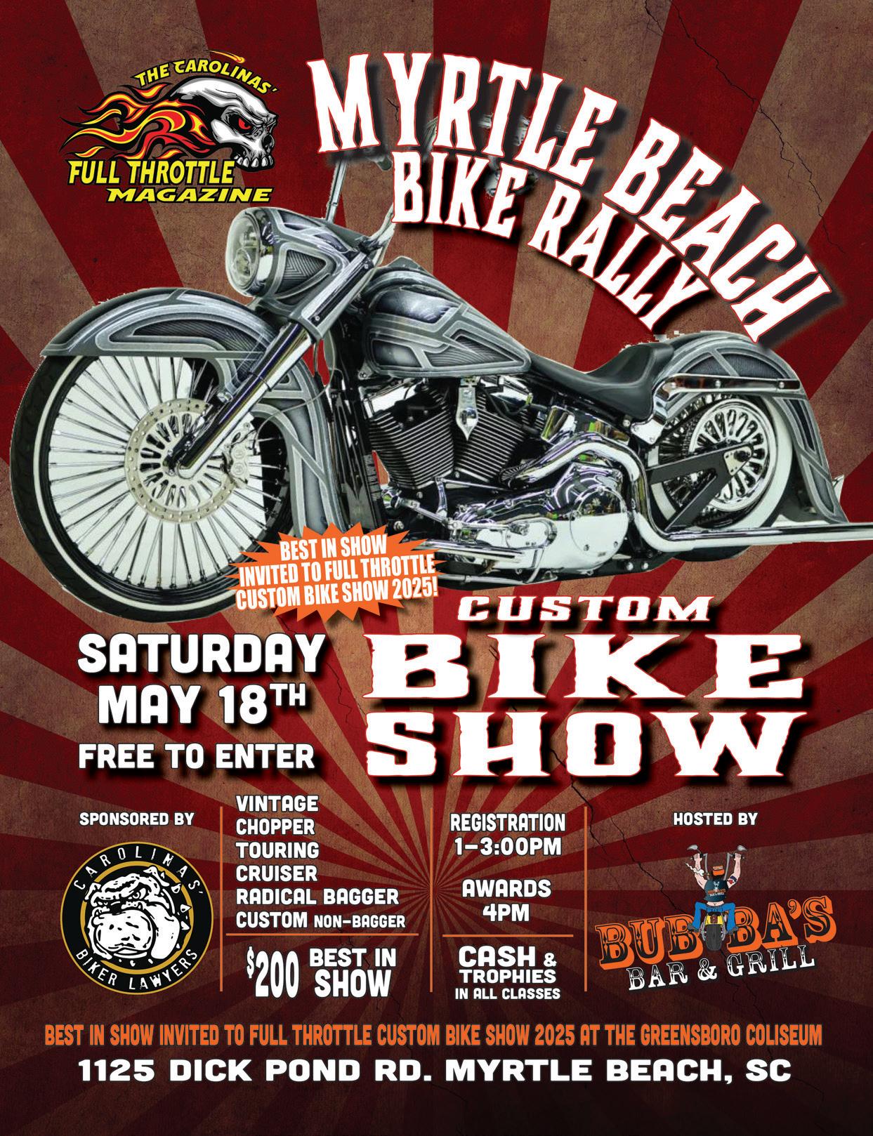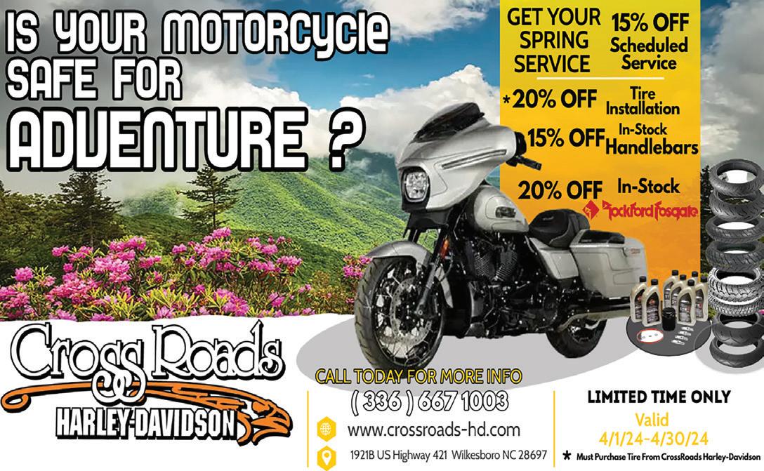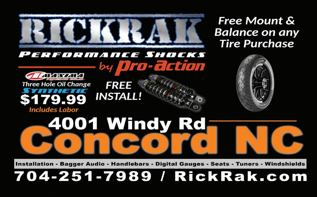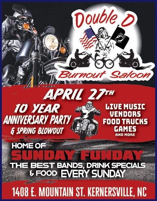 don’t know about you, but we are ready for the warm weather. It’s about time that we can just hop on the bike and leave for the day without extra layers of clothes and leather. At the same time, I’d like to skip the pollen season. But if a bandana over my face is the only extra layer I have to wear for a month, I’m ok with that. There are PLENTY of places to ride and events to attend in the April Cruisin’ Calendar on page 8. Hopefully you pick something new to attend and have an adventure. At its widest the Carolinas are around 600 miles across, that can be ridden by highway in one day if you’d like, or you can take the backroads and draw it out. We’ve got mountains, beaches and great riding roads in between! The point is, that there is a good amount of territory here in the Carolinas to explore and it’s not too far to get from one end to the other to check out something new. Whatever your riding style, get out there and put on some miles and enjoy the Carolinas from the back of a motorcycle. Make sure to take your Full Throttle Magazine with ya. It makes for some good reading or if you get in a pinch you can wipe your ass with it, just don’t get it on my picture. While you are out riding, you should check out Springers in Greensboro, NC. It is a destination biker bar that features all your favorites: Bike Nights, Parties, Live Music, Cold Drinks, Rides and all things biker. Their 4th Anniversary shindig is gonna go off on April 20th and you should make it a point to be there. If ya miss that and go to Myrtle Beach Bike Week they will be partying there as well. Read all about it in the Cover Story on page 4. We will see ya at both parties!