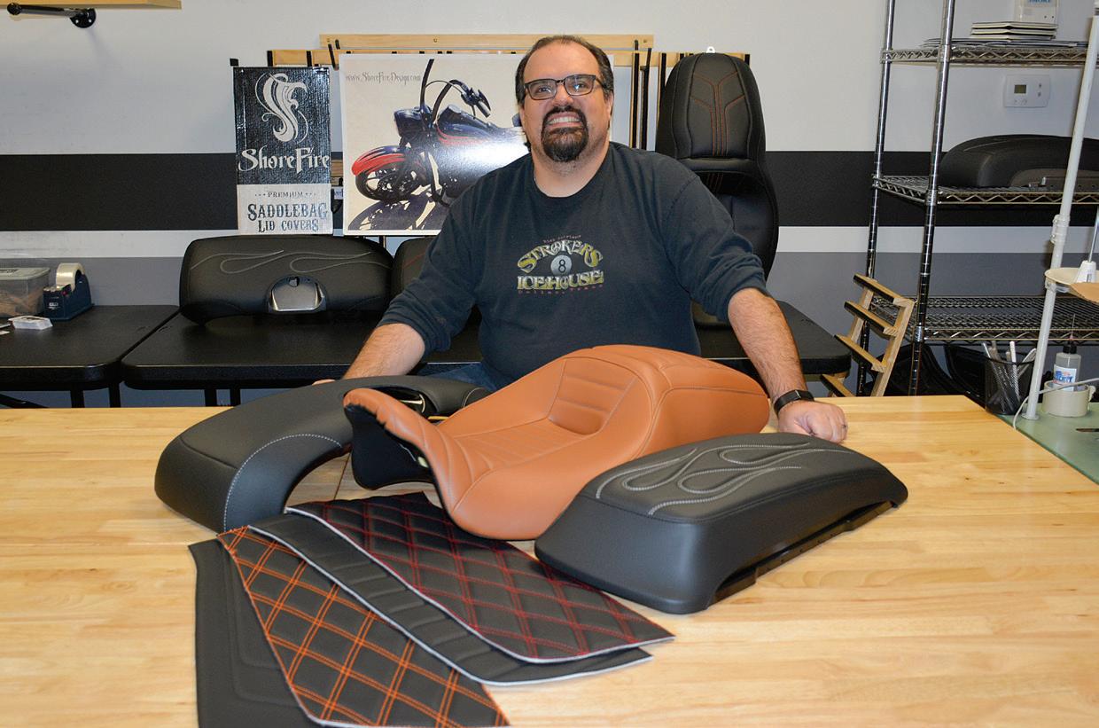 seats that he completed as a side gig to his career in Corporate Finance. Necessity is the mother of all inventions, and it wasn’t long before he was contacted about making some saddle bag lid covers. “It all started with a Craigslist ad. This gentleman had some aftermarket saddle bags lids. They were wider, they were different dimensions from the Harley-Davidson ones. So he wanted some lid covers for those. At the time I wasn’t aware this was a thing.” Joe explained. But after some research he found out that other saddle bag lid covers existed, but they were pain to fit to saddlebags and boring with little options other than black and possibly some chrome studs. Joe continued to say, “It was just vinyl. There was no padding, no stitching, no colors, no protection from them and they didn’t fit that well.” Joe took the job with the idea of making a better saddle bag lid cover, by making it fit correctly and adding padding and fleece for protection. Although the first set of ShoreFire saddlebag lid covers was plain, Joe “loved to put flames on everything” and would work out dimensions for future customized patterns. “The function of the product always came first, we wanted it to perform top notch, we wanted it to have the right fit, we didn’t want any wrinkles, we wanted it to stay put, you know. We wanted to make the product a superior product at the beginning and then add the esthetics to it.” Joe explained. Joe’s ShoreFire Design Saddlebag Lid Covers now come in a variety of stitching patterns including Flame Thrower, Breakaway, Tuck ‘N Roll, Classic Pinstripe, Double Diamond and even a faux gator skin cover named