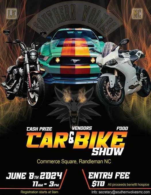 BIKE SHOW Holly Hill Mall, 309 Huffman Mill Rd., Burlington, NC. Reg, Fri: 5:30-8pm, Sat: 9am-12pm, $25/daily riders, $50/show bikes. Vendors, auction, raffles, bake sale. Proceeds go to Hospice of Alamance Co. Rick Murray, 919-656-6900, Lance Greene, 919-357-0104