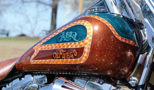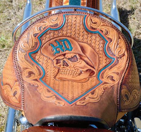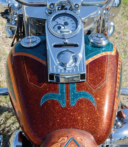 But this bike isn’t just a show bike and Rodney puts down miles with it with the Foothills Riding Group that he is a part of. They hit up local bike nights and hit up the backroads and go up through the country. “Everytime I ride this thing, it draws a crowd. I’m very proud of this bike. It was a vision I had and Ray Spencer and Mike Calhoun, big thanks to them” Rodney says, and we believe him, it’s absolutely stunning. No doubt if you see Rodney and Aqua Fuego out and about you need to go check it out. The details of the paint and the seat are amazing and the whole bike is drenched in chrome, just the way we like em!