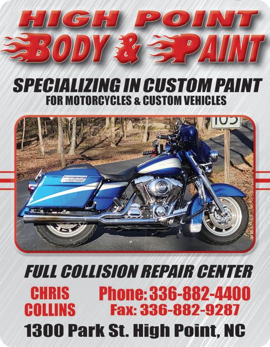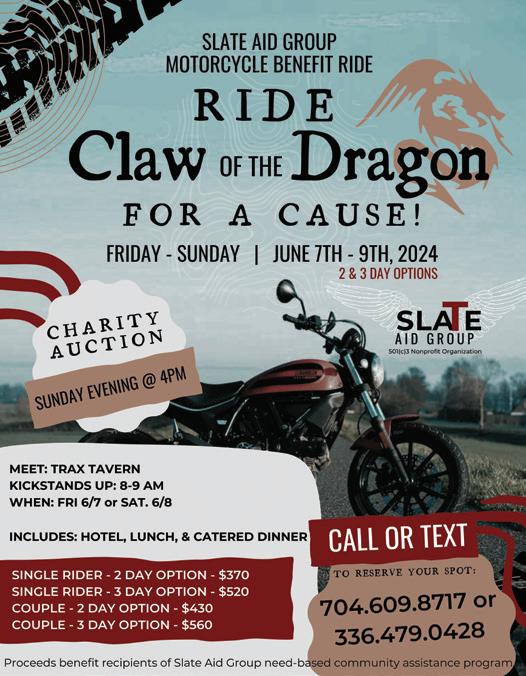 APR 13 11TH ANNUAL CRUISIN’ FOR A CAUSE Rixster Grill, 3815 Tinsley Dr., High Point, NC. Reg 10:30am, KSU 12:15pm, $20/ bike, $10/rider, 50/50, police escort, raffles. Benefits Victory Junction. 336-883-3900