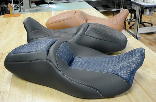 Feedback also led Joe to get back to his upholstering roots with recovering seats. Joe primarily did seat recovering for the first two years of his career at ShoreFire Design before shelving the seat process to develop and grow the saddlebag lid covers. Once the saddlebag lid covers were going well, they started getting inquiries from their customers about recovering seats to match their saddlebag lids. The premium seat covers are not yet on the website but Joe is taking appointments by phone for seatwork for the Harley Davidson “Low” Seat #24688 for their touring line from 2008-up. These ShoreFire seats will have added padding over what stock seats offer, premium material construction, customization options and enhanced styling installed at a fraction of the cost of a whole new seat.