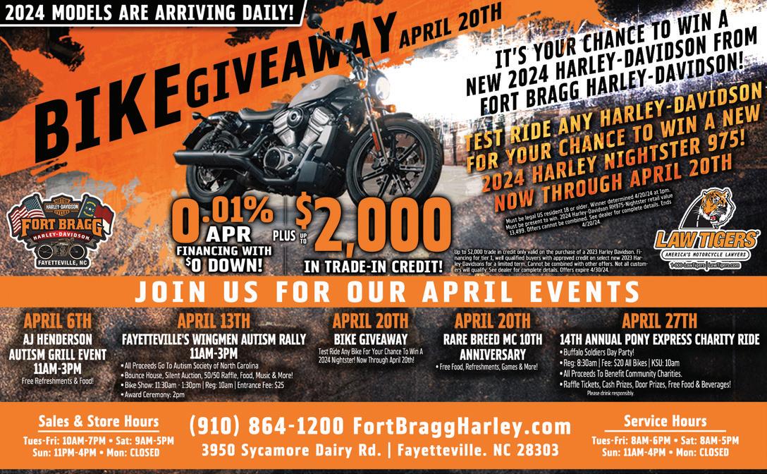 APR 6 AJ HENDERSON AUTISM GRILL EVENT Fort Bragg Harley-Davidson, 3950 Sycamore Dairy Rd., Fayetteville, NC. 11am3pm, free refreshments & food. www.fortbraggharley.com, 910-864-1200