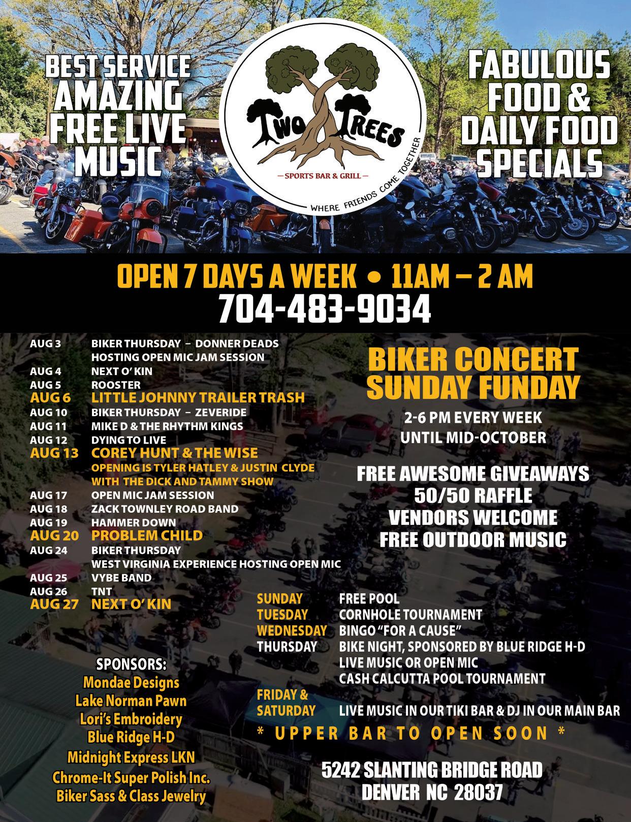 AUG 13 BIKER APPRECIATION SUNDAYS Kanawha Valley Arena, 121 Kanawha Ridge Rd., Dugspur, VA. 12-4pm, live music, free food, live entertainment. 704-400-5689