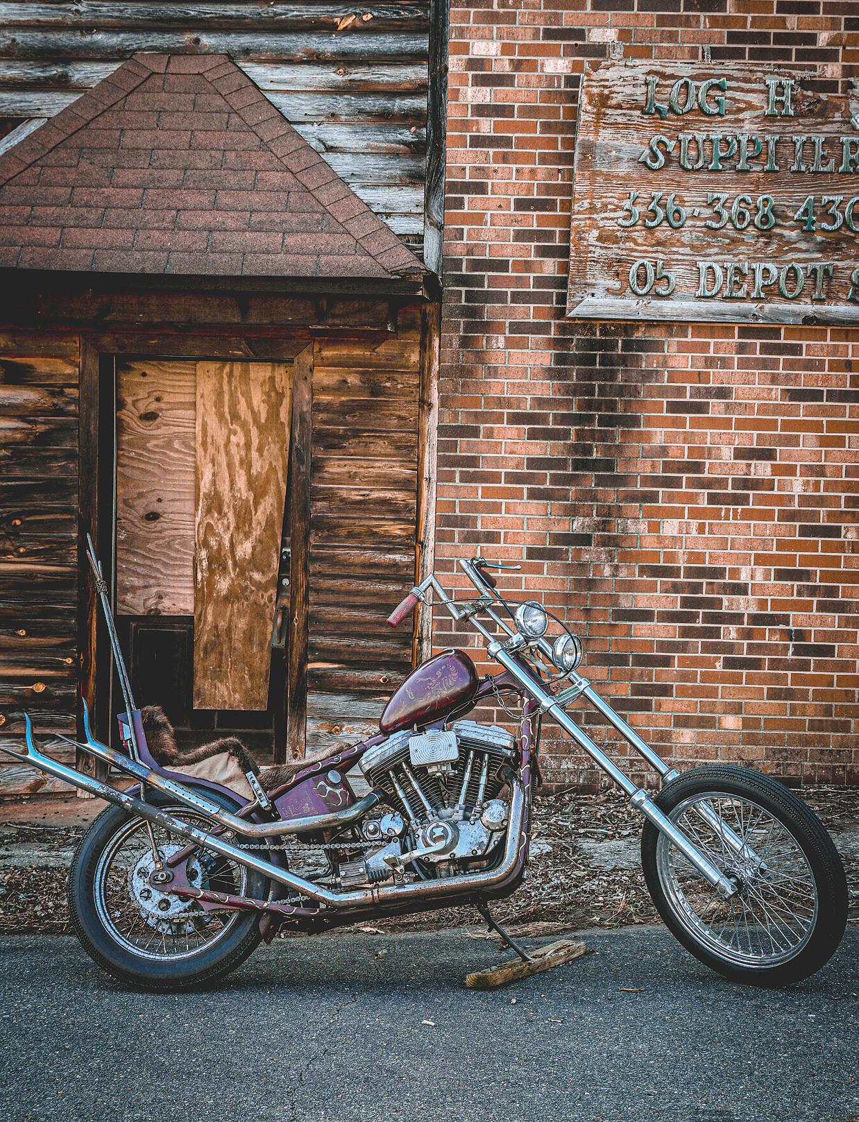 He (Jacob) picked up a 1987 Harley-Davidson xlh1100 and didn’t waste any time stripping the bike down and creating his vision of the perfect garage built, 70’s inspired chop. Jacob wanted something cool that he could carry limited tools to work on the bike with, if anything were to occur, roadside. This proved extra handy on our mission to shoot the accompanying photos as we no sooner made it out of Jacob’s driveway when his throttle cable broke. After a quick fix he had her back up and running and we were able to make a few photos to showcase his hard work.