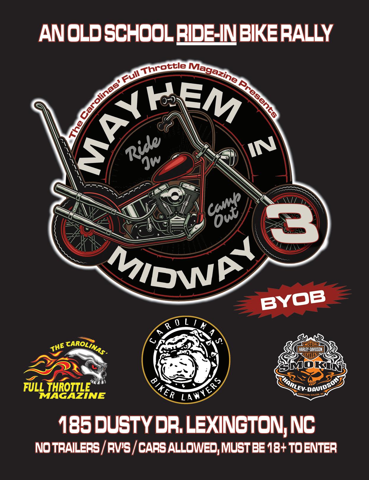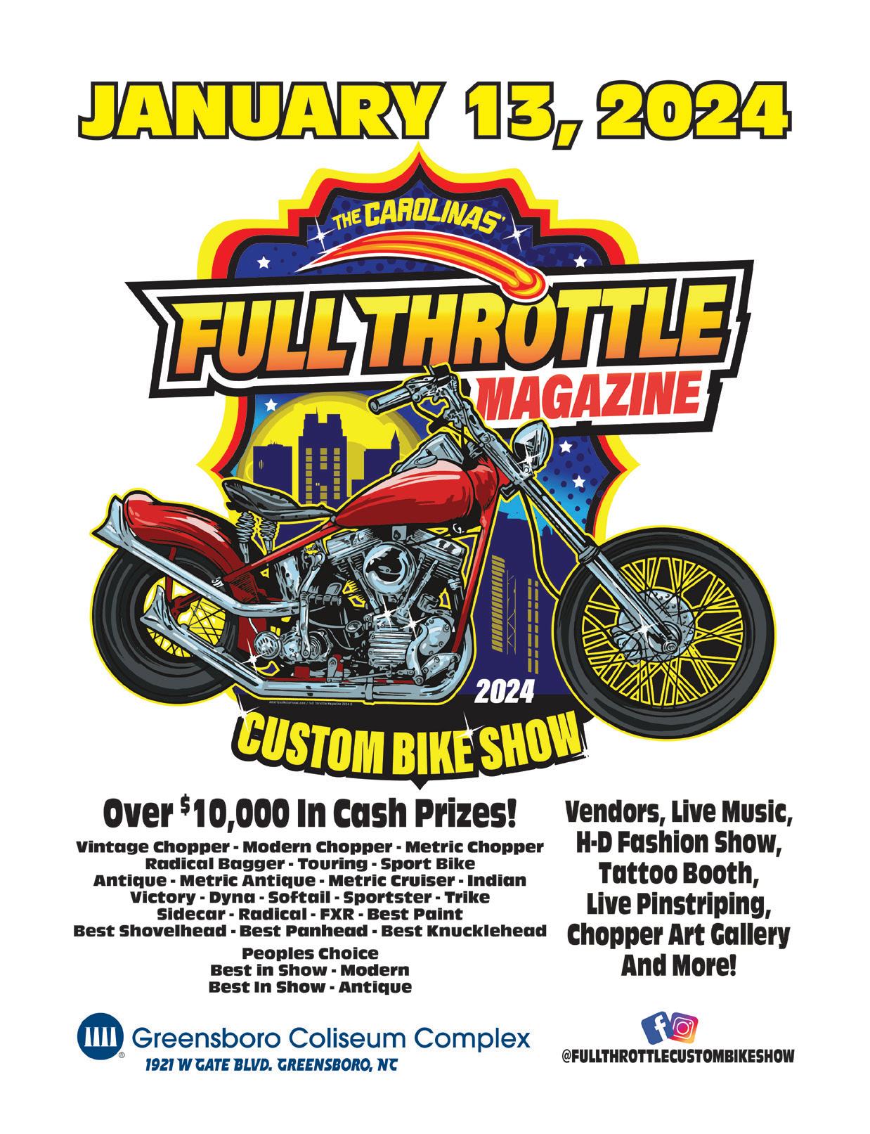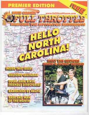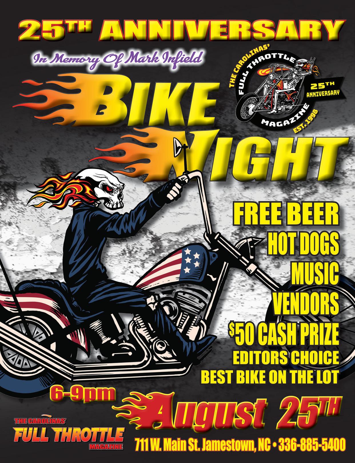 AUG 25 CAROLINAS’ FULL THROTTLE MAGAZINE 25TH ANNIVERSARY BIKE NIGHT 711 W. Main St., Jamestown, NC. 6-9pm, free beer, hotdogs, music, vendors, best bike on the lot, cash prize. In Memory of Mark Infield. www.fullthrottlemagazine.com, 336-885-5400