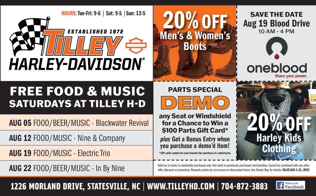AUG 12 FREE FOOD & MUSIC SATURDAY Tilley Harley-Davidson, 1226 Morland Dr., Statesville, NC. 12pm, food & music. www. tilleyhd.com, 704-872-3883