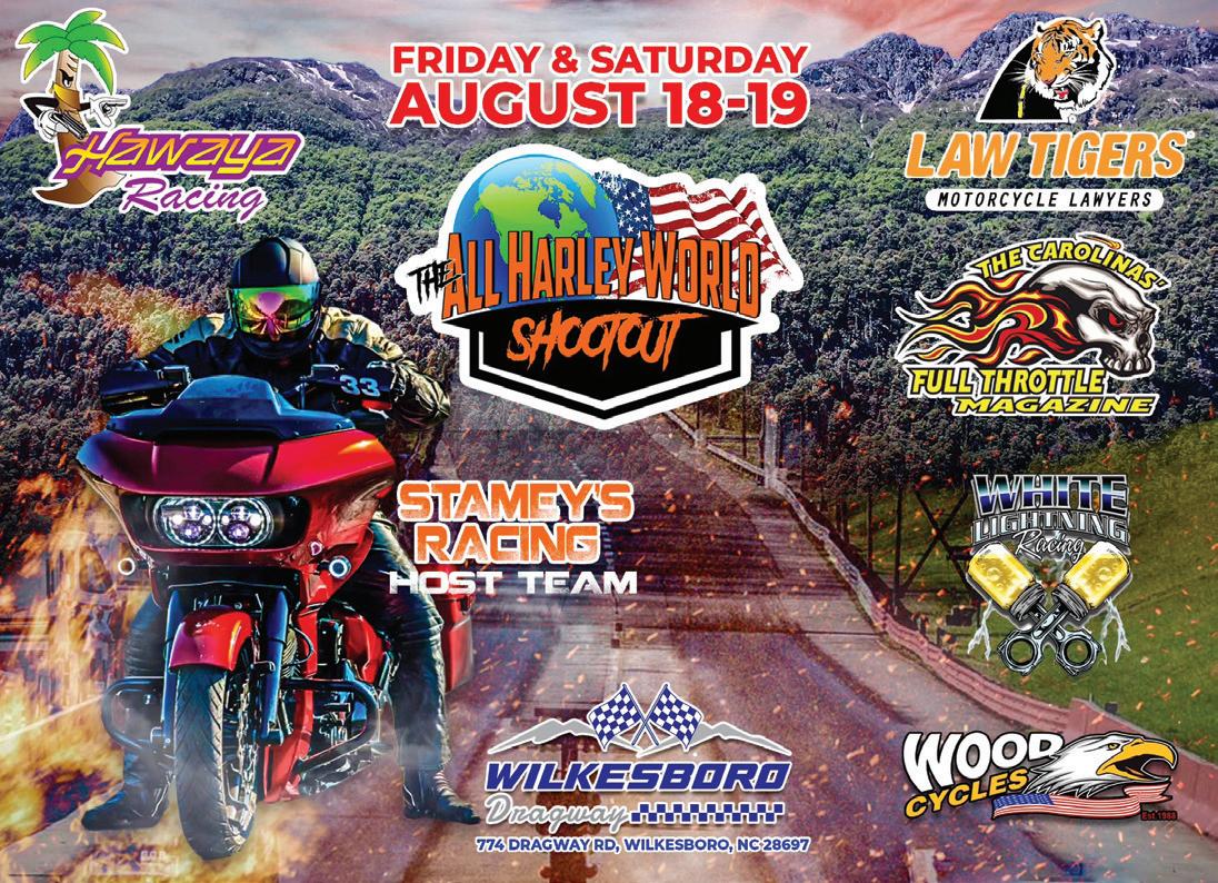 SHOOTOUT Wilkesboro Dragway, 774 Dragway Rd., Wilkesboro, NC. Muddy Creek Revival Friday 6-10. Andy Simon is going for a new record for a 4 Second Harley in the 1/8. Nitros, Turbos, Pro Chargers, NOS. World’s Fastest Minibike coming from Detroit Michigan.