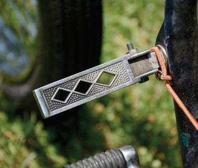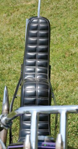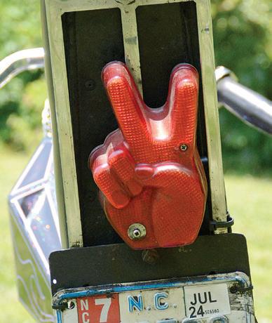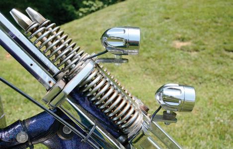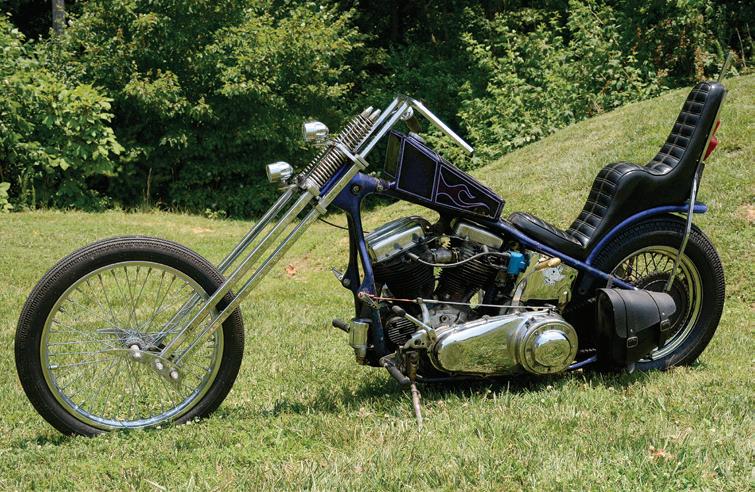 hoprag’s 1951 panhead chopper got nicknaMed “disco stick” By his friends. at the tiMe lady gaga was at her height and the purple metal flake paint of the chopper lent itself to lyrics from the song LoveGame. The story goes, that the old man chopped this sweet panhead and was building it to give to his son as a graduation present. The son did not graduate from high school and the bike was parked in the barn waiting for the grandson to be eligible. Shoprag stumbled upon this bike when the grandson brought the panhead in to trade it for a Fatboy. Since Shoprag acquired the bike he has ridden “the bejesus” out of the bike including trips to Kentucky and Born Free in California. He did have to rebuild the engine one time. Ten miles from his destination in KY, the engine locked up. Shoprag said, “We’d been running down the road from North Carolina and I could taste the Miller Lite already. I thought I had run out of gas, so I was smart enough to push in the clutch and just coast it over the side. Come to find out I locked the motor up. I welded the case bearing basically together and how I didn’t go down, I don’t know but I saved the motor and I was just able to tear down rebuild it and put it back together.” Fortunately, he was able to finish his trip on friends Shovelhead. There’s plenty of cool features on this bike including a duck head shifter that came off the legendary Papa Joe’s (R.I.P.) dad’s cane, peace sign taillight and diamond foot pegs. Shoprag put them on because, “Mom always said when I was young, if you found the right woman in your life you always give her a diamond”. There’s a bit more to this bikes story that you can catch on our YouTube page or if you see Shoprag out and about, ask him about his Disco Stick!