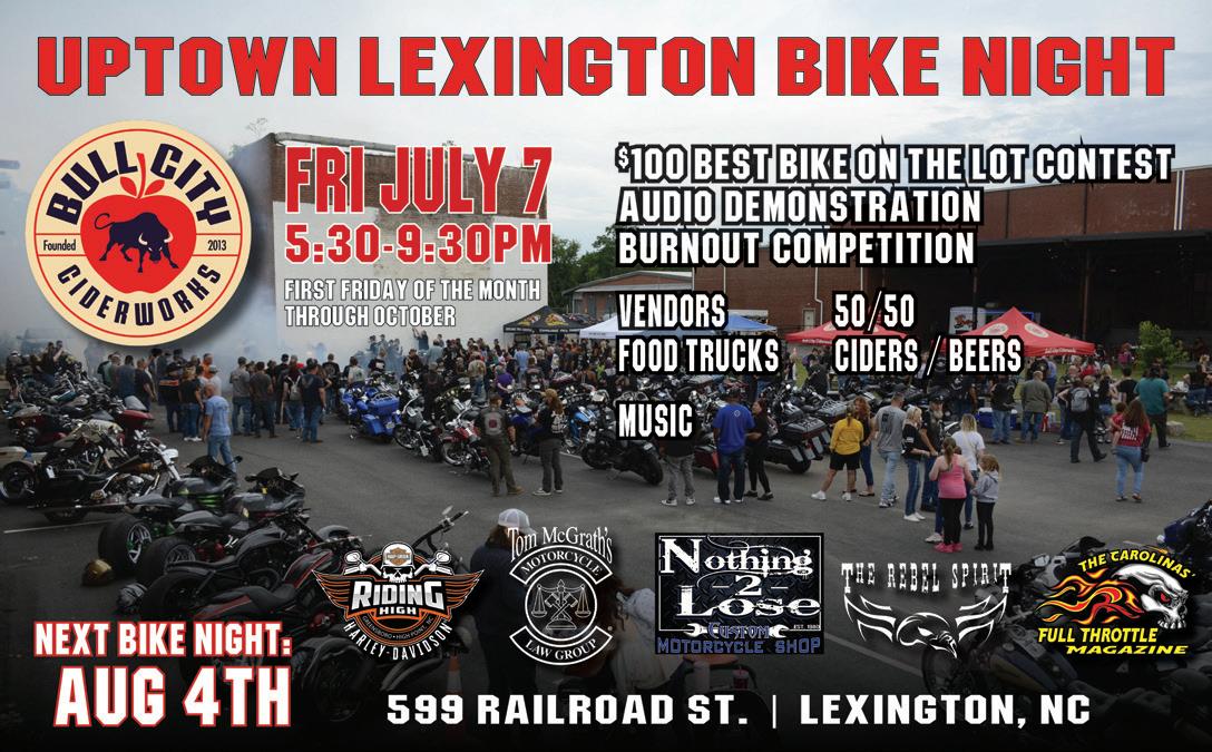 JUL 7 UPTOWN LEXINGTON BIKE NIGHT Bull City Ciderworks, 599 S Railroad St., Lexington, NC. 5:30-9pm, music, food trucks, vendors. Benefits Hospice of Davidson County. Jack Waters, jackw@bullcityciderworks.com, 336-425-5959