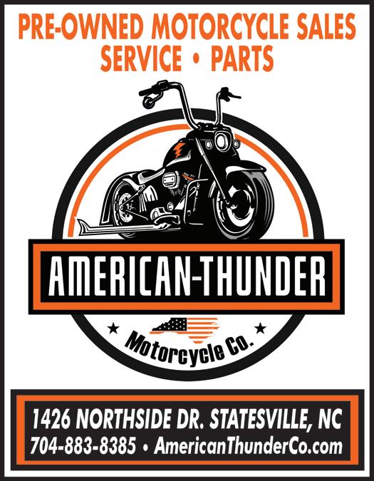The Carolinas’ Full Throttle P.O. Box 2294 Jamestown NC 27282 (336) 885-5400 • Fax (336) 833-6794 Editor@FullThrottleMagazine.com www.FullThrottleMagazine.com The Carolinas’ Full Throttle Magazine 2023 is published monthly and no reproduction of any content is permitted except by prior express written approval of Molly A. Infield, Publisher, Editor, & CEO. Publisher assumes no financial responsibility for errors in ads beyond the cost of space occupied by error. Publisher is not liable for: any slandering of an individual or group, as we mean no malice or individual criticism at any time. We are not responsible for the opinions or comments of our columnists. The advertisers are solely responsible for content of their ads, promises, and coupons, or any lack of fulfillment thereof. Publisher is also to be held harmless from: failure to produce any issue as scheduled due to reasons beyond control; all suits, claims or loss of expenses; including but is not limited to: suits for libel, plagiarism, copyright infringement, and unauthorized use of a person’s name or photograph. Publisher does not promote excessive consumption of alcoholic beverages.