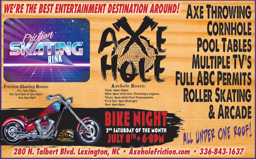 JUL 8 AXEHOLE BIKE NIGHT 280 N. Talbert Blvd., Lexington, NC. 6-8pm, www.axeholefriction.com, 336-843-1637