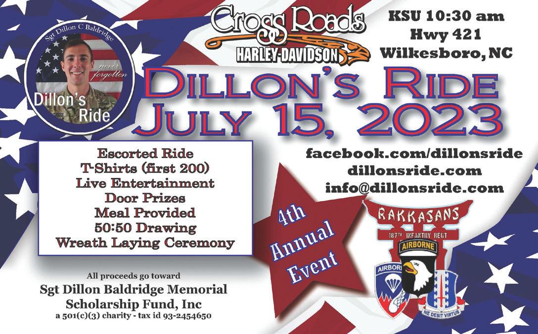 ride, shirts, live entertainment, door prizes, food, 50/50, wreath laying ceremony. Proceeds go to Sgt Dillion Baldridge Memorial Scholarship Fund, Inc. www.dillonsride.com, info@dillonsride.com