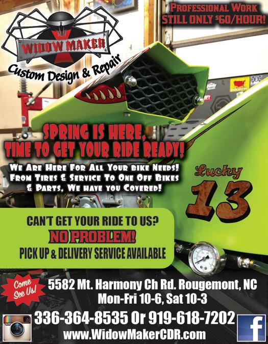 65 www.FullThrottleMagazine.com MICHAEL BELAND Harley Specialist Dyno Tuning Performance Engine Builds Full Machine Shop Services Custom Builds, Welding + Fab 561-603-6671 www.a1cycles.net 4336 S NC Hwy 16. Maiden NC 20 Years In Business By Appointment Only @a1cycles.net @a1mike TRY AND KEEP UP! LOWDOGG PERFORMANCE TUNERZ LLC JAMIE CHAVIS JASON JONES 118 Allenton Road lumberton, nc 28358 910-887-2228