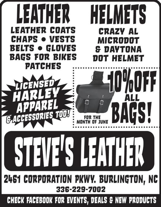 JUN 16 SPECIAL FATHER’S DAY WORSHIP RALLY Freedom Biker Church, 669 Tarheel Rd., Benson, NC. Live music, refreshments. Christy@ freedombikerchurch.com, 919-550-3733