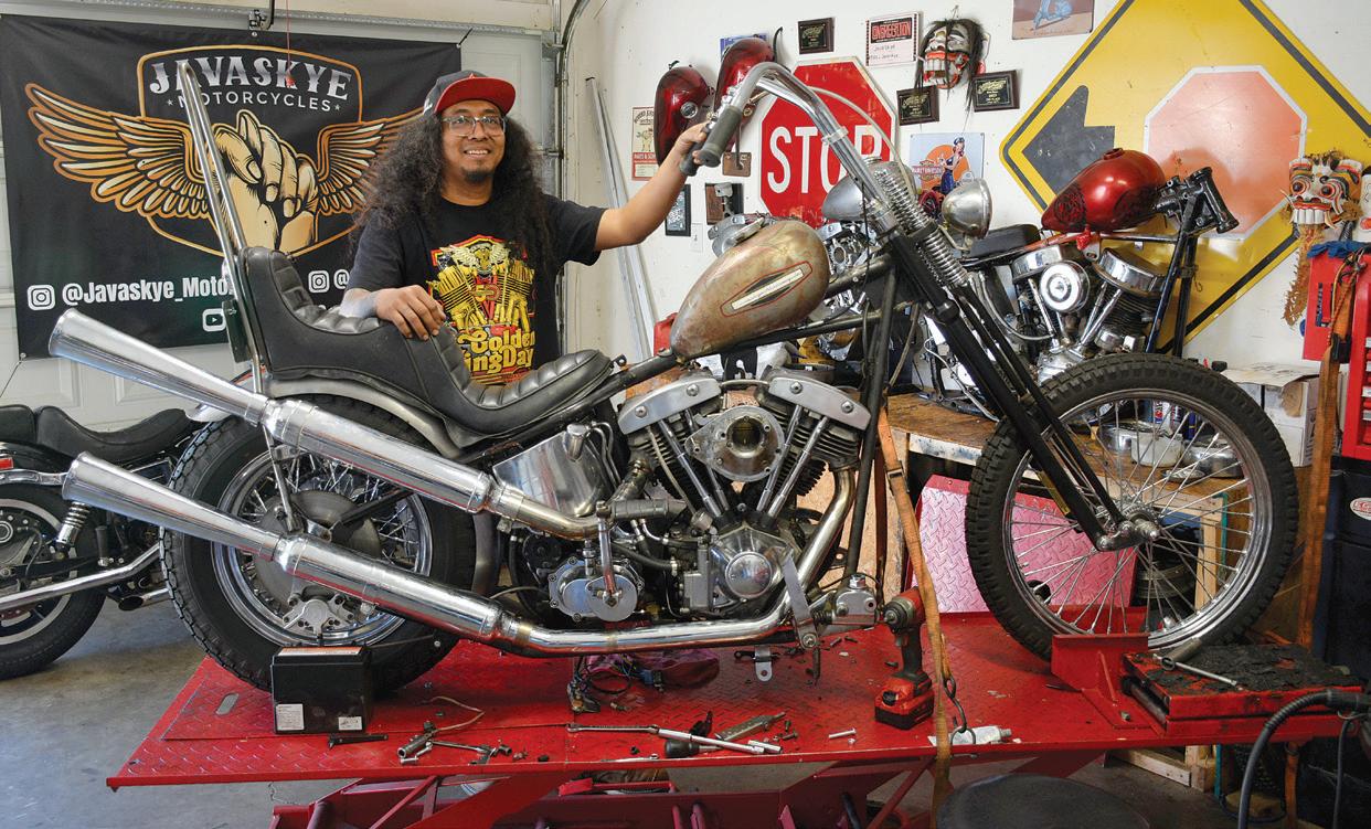 bike. We took it to our shop in Florida. That’s Holeshot Cycles, me and Chris. I’ve been a contractor my whole life, but we also had a bike shop down there. It was attached to my construction building and night time was working on motorcycles. Later we bought a stock Sportster chassis and took it too Andy Simon who built us a serious race bike. I was running out of this shop for a bit,” Mike said