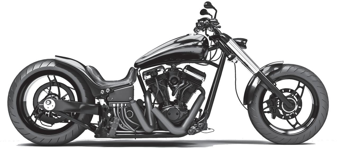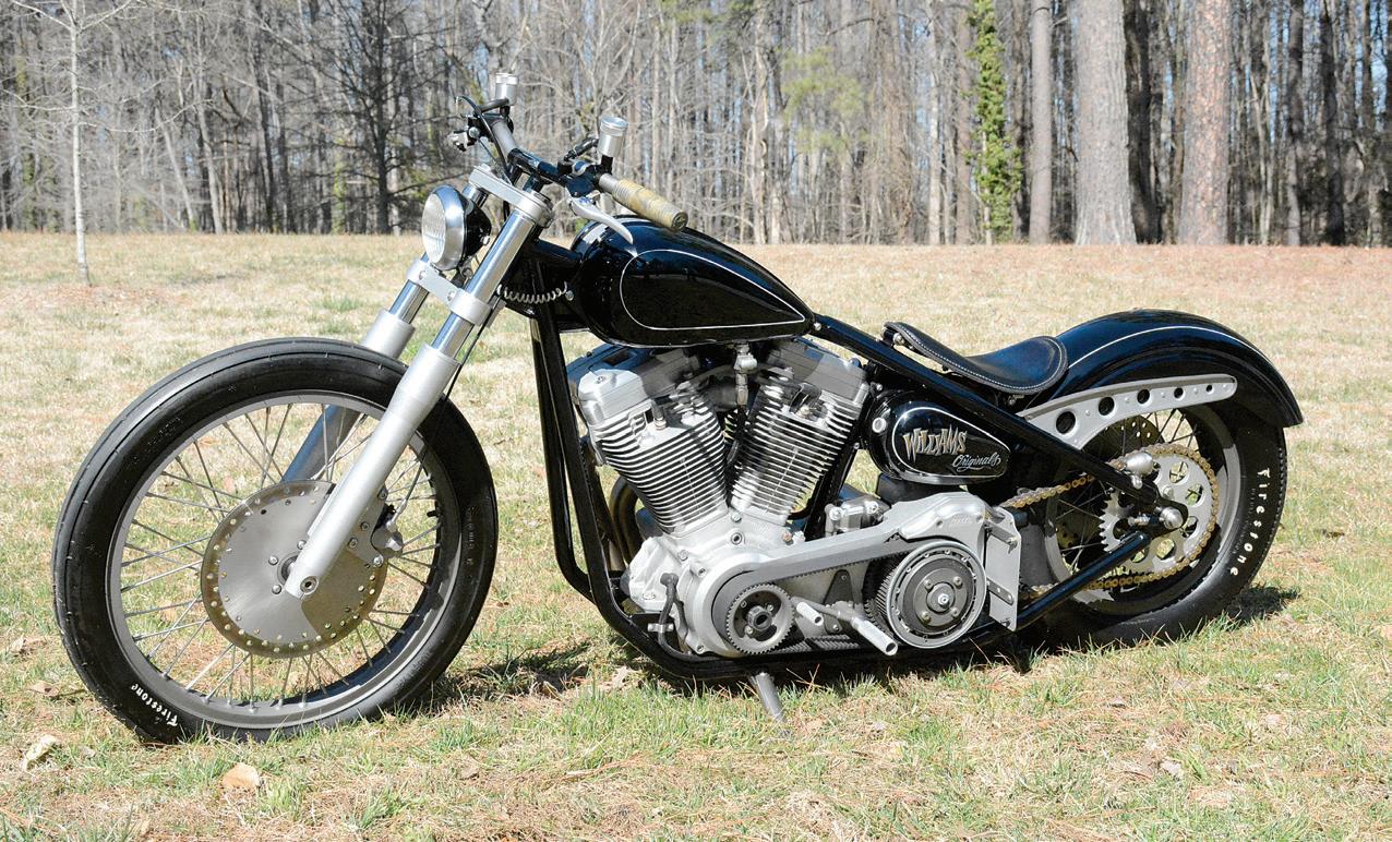heck out Byron Weeks’ one-off custom Bike, Built By scott Williams of ohio, hence the Williams original moniker on the side case. Actually, it’s one of two “matching bikes” the other being a Honda race bike with similar features. The bikes had to be bought as a pair and Byron ended up splitting the purchase with a friend. This bike features a satin finished 1992 built Evo engine with S&S tear drop air cleaner, Vance & Hines 2 into 1 exhaust, driven by a Baker 1.5” Bore transmission all held together in a Kraft Tech hardtail frame. The bike is covered in custom made parts including machined front and rear brake and clutch reservoirs, matching satin metal tank rib and rear fender struts, custom machined foot pegs and foot controls. The power side of the bike features a 2 ½ inch BDL open belt drive that is a “shoe ripper and a pants ripper”. The Moon Equipped Chopper Oil Tank sits just below the frame mounted seat, consisting of little more than metal and leather, but makes for great looking lines on the bike. Little features like the old school fabric wrapped wiring from the headlight, satin disc rotors and frame mounted 1 inch tail light and vintage Firestone tires bring it together. Byron says, “It’s just a cool ass bike, I love it, it rides great and it looks good!!” We have to agree that this is a well thought out build with a tight design.