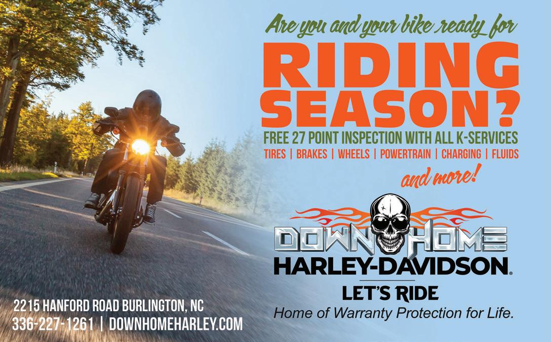 SEASON OPENER Riding High HarleyDavidson, 3036 NC Hwy 68, High Point, NC. 10am-4pm, free food, raffles & more. www. ridinghighharleydavidson.com, 336-273-1101