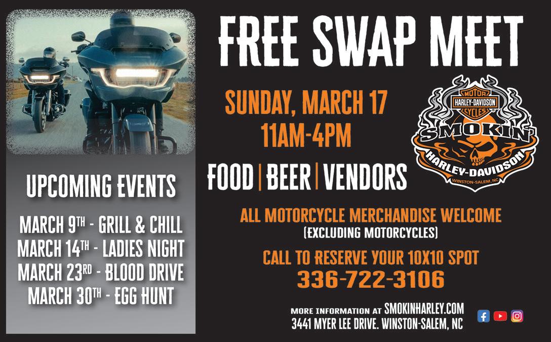 MAR 17 SMOKIN HARLEY-DAVIDSON FREE SWAP MEET 3441 Myer Lee Dr., Winston-Salem, NC. 11am-4pm, food, beer, vendors, call to reserve your spot, 336-7223106, www.smokinharley.com