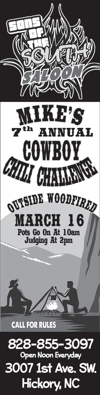 CHILI CHALLENGE Sons Of The South Saloon, 3007 1st Ave. SW., Hickory, NC. Pre-reg required, pots go on at 10am, judging 2pm, trophies & cash prizes, liquor tasting. Call for rules, 828-855-3097