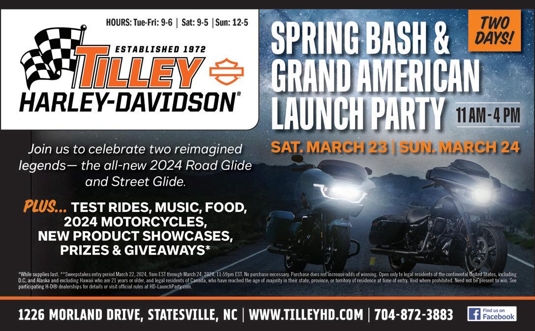 MAR 23-24 TILLEY HARLEY-DAVIDSON SPRING BASH & GRAND AMERICAN LAUNCH PARTY 1226 Morland Dr., Statesville, NC. 11am-4pm, test rides, music, food, prizes & giveaways. www.tilleyhd.com, 704872-3883