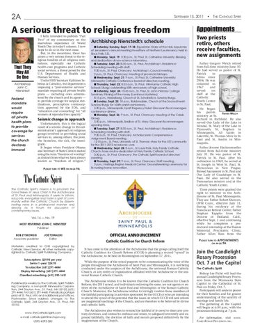 Archbishop Nienstedt’s schedule ■ Saturday-Sunday, Sept. 17-18: Equestrian Order of the Holy Sepulchre of Jerusalem’s annual meeting/investiture of Northern Lieutenancy held in Sioux Falls, S.D. ■ Monday, Sept. 19: 3:30 p.m., St. Paul, St. Catherine University: Blessing and dedication of new science laboratory. ■ Tuesday, Sept. 20: 8:30 a.m., St. Paul, Archbishop’s Residence: Scheduling meeting with staff. 9:30 a.m., St. Paul, Chancery: Archbishop’s Council meeting. 2 p.m., St. Paul, Chancery: Meeting of provincial bishops. ■ Wednesday, Sept. 21: 9 a.m., St. Paul, St. Catherine University: Minnesota Catholic Conference board of directors meeting. ■ Thursday, Sept. 22: 8:55 a.m., St. Paul, Hill-Murray Catholic High School: Liturgy celebrating 50th anniversary of high school. ■ Saturday, Sept. 24: 10:45 a.m., St. Paul, St. John Vianney College Seminary: Filming of the rosary (Luminous Mysteries). 8:15 p.m., Heidelberg, Church of St. Scholastica: Sunday liturgy. ■ Sunday, Sept. 25: 10 a.m., Robbinsdale, Church of the Sacred Heart: Sunday liturgy for 100th parish anniversary. 5:30 p.m., Minneapolis, Hyatt Regency Hotel: Diocesan fiscal managers conference dinner. ■ Monday, Sept. 26: 9 a.m., St. Paul, Chancery: Meeting of the Caleb Group. 5:30 p.m., Minneapolis, Basilica of St. Mary: Diocesan fiscal managers opening Mass. ■ Tuesday, Sept. 27: 8:30 a.m., St. Paul, Archbishop’s Residence: Scheduling meeting with staff. 9:30 a.m., St. Paul, Chancery: Archdiocesan Comprehensive Assignment Board meeting. 12:10 p.m., St. Paul, University of St. Thomas: Mass for the UST community for the 2011-2012 academic year. ■ Wednesday, Sept. 28: 8 a.m., St. Louis Park, Holy Family Catholic Church: Mass and re-dedication of Holy Family Catholic School. 3:30 p.m., St. Paul, Chancery: The Catholic Spirit board of directors’ meeting. ■ Thursday, Sept. 29: 9 a.m., St. Paul, Chancery: Staff meeting. 3 p.m., Hastings,Regina Medical Center: Groundbreaking ceremony for its nursing home renovation.