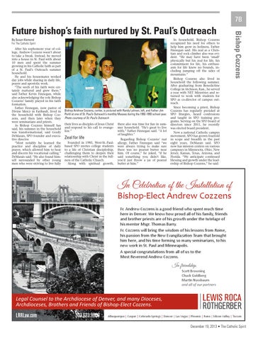 7B By Susan Klemond For The Catholic Spirit After his sophomore year of college, Andrew Cozzens wasn’t about to take a break. Instead, he moved into a house in St. Paul with about 10 men and spent the summer growing in his Catholic faith as part of a St. Paul’s Outreach summer household. He and his housemates worked day jobs while sharing in daily life, prayer and apostolic work. “The seeds of his faith were certainly nurtured and grew there,” said Father Kevin Finnegan, while also acknowledging the role Bishop Cozzens’ family played in his faith formation. Father Finnegan, now pastor of Divine Mercy in Faribault, lived in the household with Bishop Cozzens, and then later when they were seminarians and priests. As Bishop Cozzens himself has said, his summer in the household was transformational, said Gordy DeMarais, SPO founder and executive director. “Most notably he learned the practice and discipline of daily prayer, which allowed him to hear and discern his vocational calling,” DeMarais said. “He also found himself surrounded by other young men who were striving to live fully