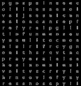 On the wall to your right, a large mural, painted with thick, black lines unfolds across white tile. Cloud-like flowers dot the composition and large letters spelling “Ave” hang in the top left corner. Just off center to the right, a loose, delicate drawing of Madonna and Child appears. Mary sweetly holds Jesus, who stretches out His arms in a posture resembling the Cross.