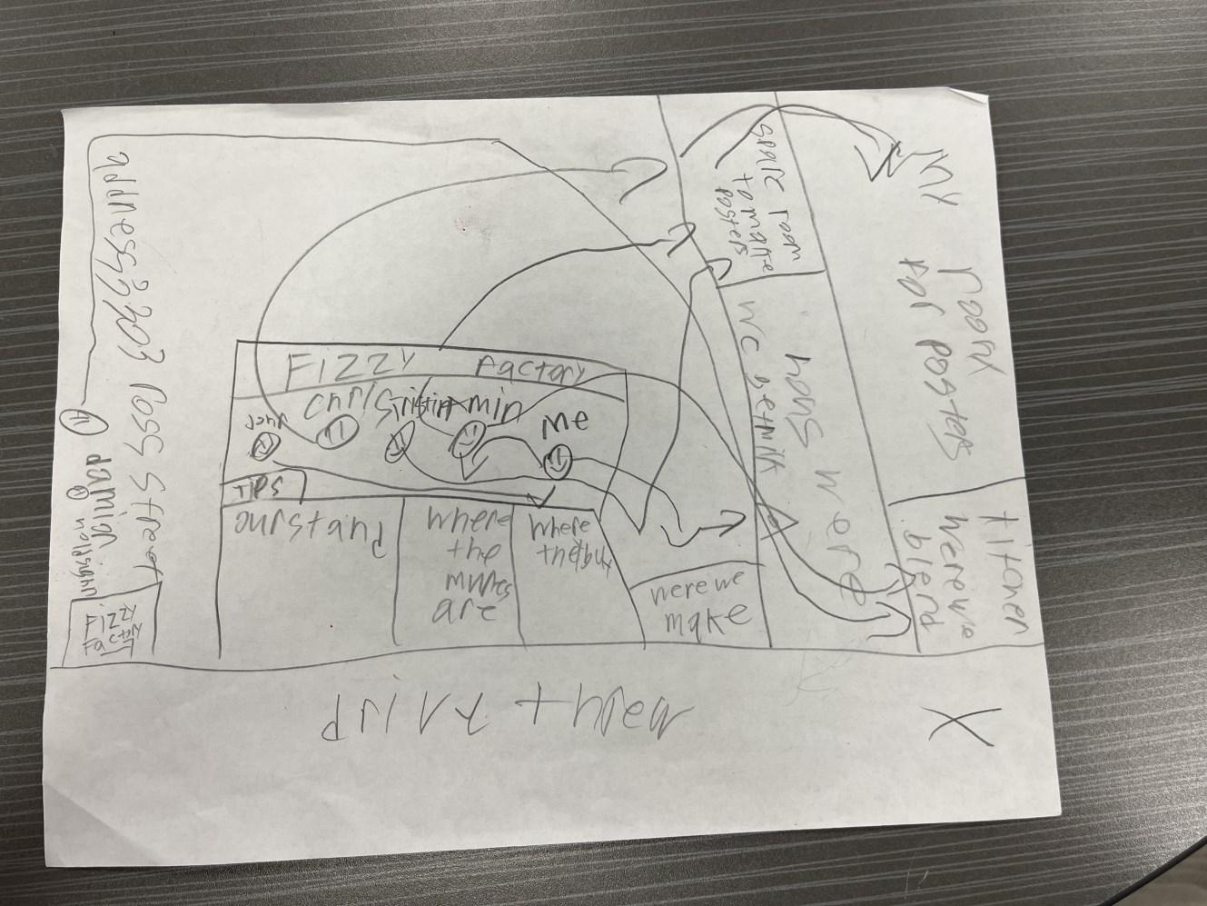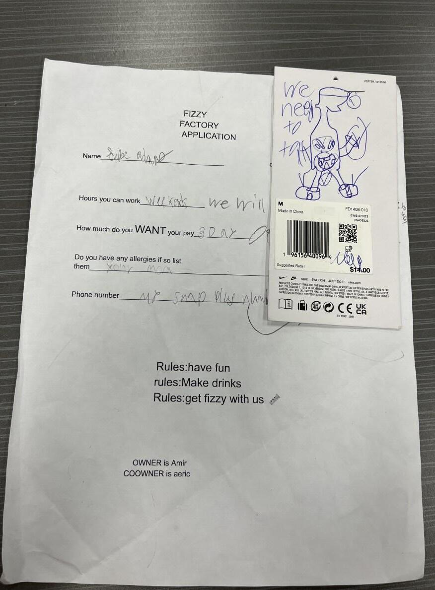 Students in Mrs. Edwards' Passport to Tomorrow class at Central Academy were recently learning about the Business, Marketing and Management Career Field. In the fifth grade class, Eric Amburgey (pictured in red in the bottom right of the photo) went above and beyond for his assignment. He created the business "Fizzy Factory." Eric and his group project team members created applications for employment, employee shirts, hourly wages, investor ideas, a drive-thru layout and samples!
