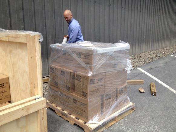 9. Shrink-wrap the pallet with the food boxes according to the following: First, twist the end of the shrink wrap until you have about a 2’ length that can be tied around one corner of the wood pallet (this serves as an anchor). Once anchored, wrap the shrink-wrap along the pallet and bottom layer of boxes to secure the boxes to the pallet itself. Once secured, add corner and top white corner guards to the boxes, and with tension, shrink wrap 3 -5 layers of wrap around the boxes. On the top of the boxes, place the small plastic sheet or leftover bin liners on the top of the boxes to protect the boxes from dripping condensation from the shipping container when at sea. Please make sure to use the white corner guards as shown in photos.