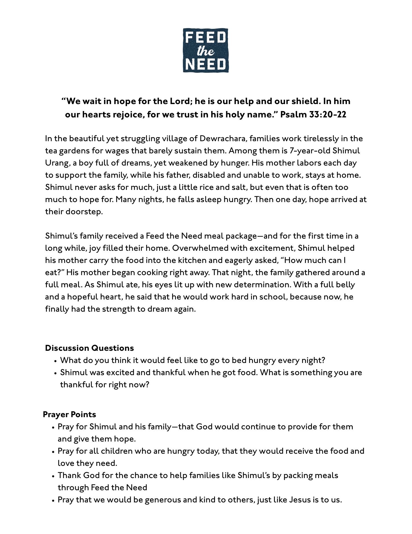 By sending the meals your students have packed across the world, Feed the Need gives your students a unique opportunity to see God’s heart for the nations and live out Mark 10:45.